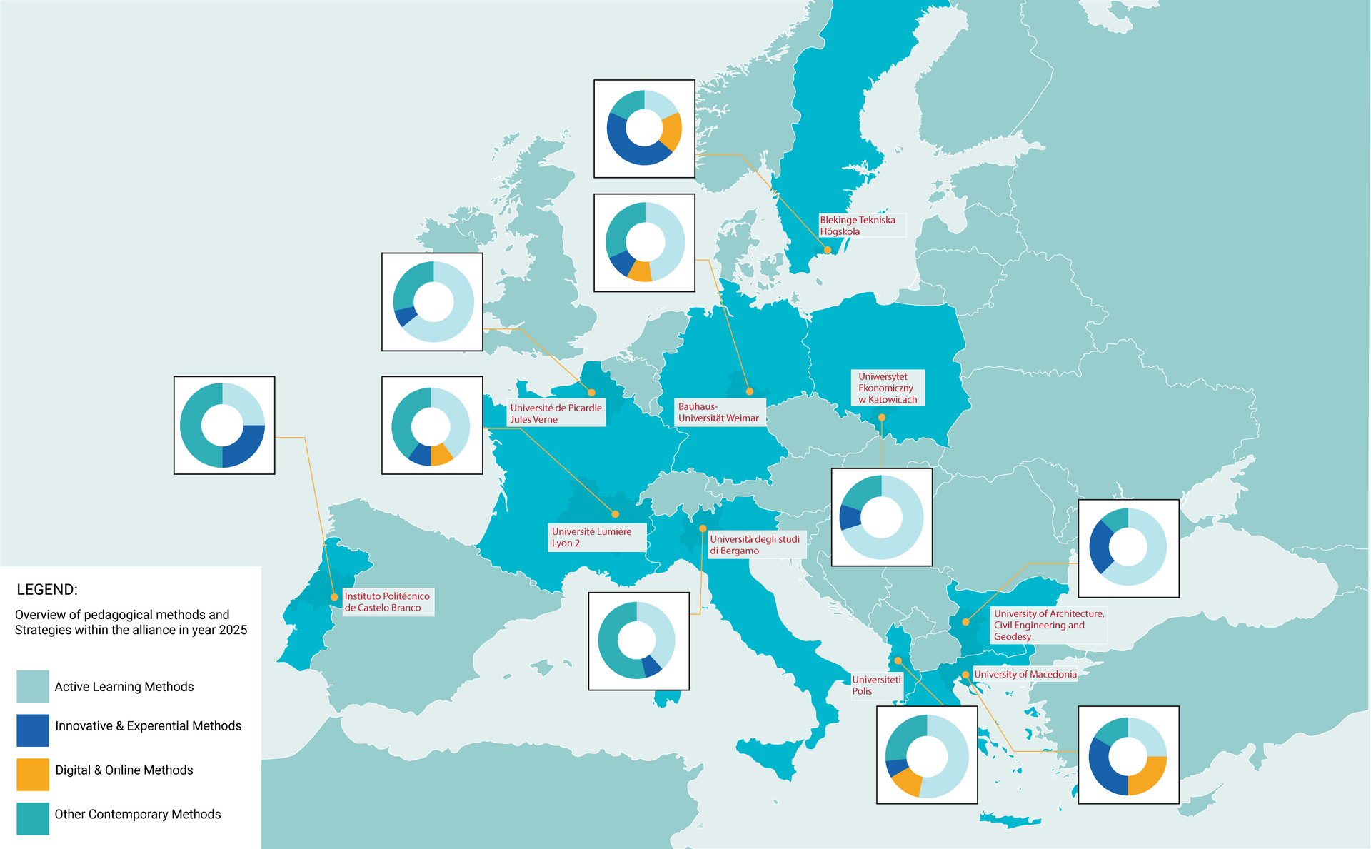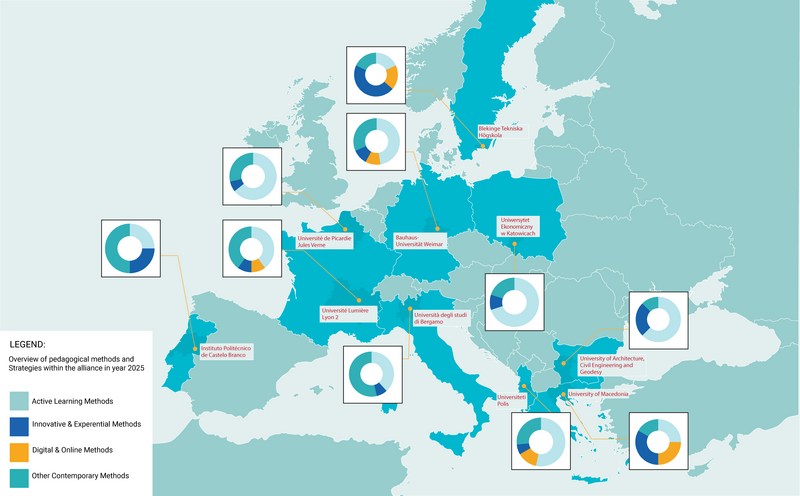 The map offers an overview of innovative pedagogical strategies and methods applied across partner institutions, supporting knowledge sharing and mutual learning within the BAUHAUS4EU alliance.