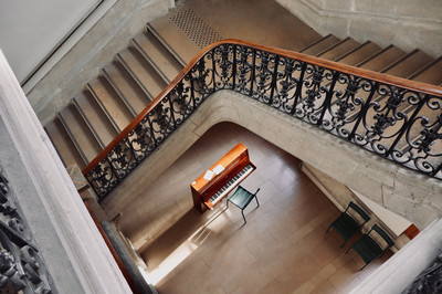 This elegant staircase symbolizes movement (students walking on it) and encircles a space to pause and create.This piano is more than an object; it's an invitation. An invitation to transform stress into artistic expression.And where individuals from every discipline can be united.This piano can serve as an invisible force binding people together.The beauty isn’t just in the architecture or the instrument alone,but in their dialogue. People can sit, stand or walk to hear the rythm of campus life.